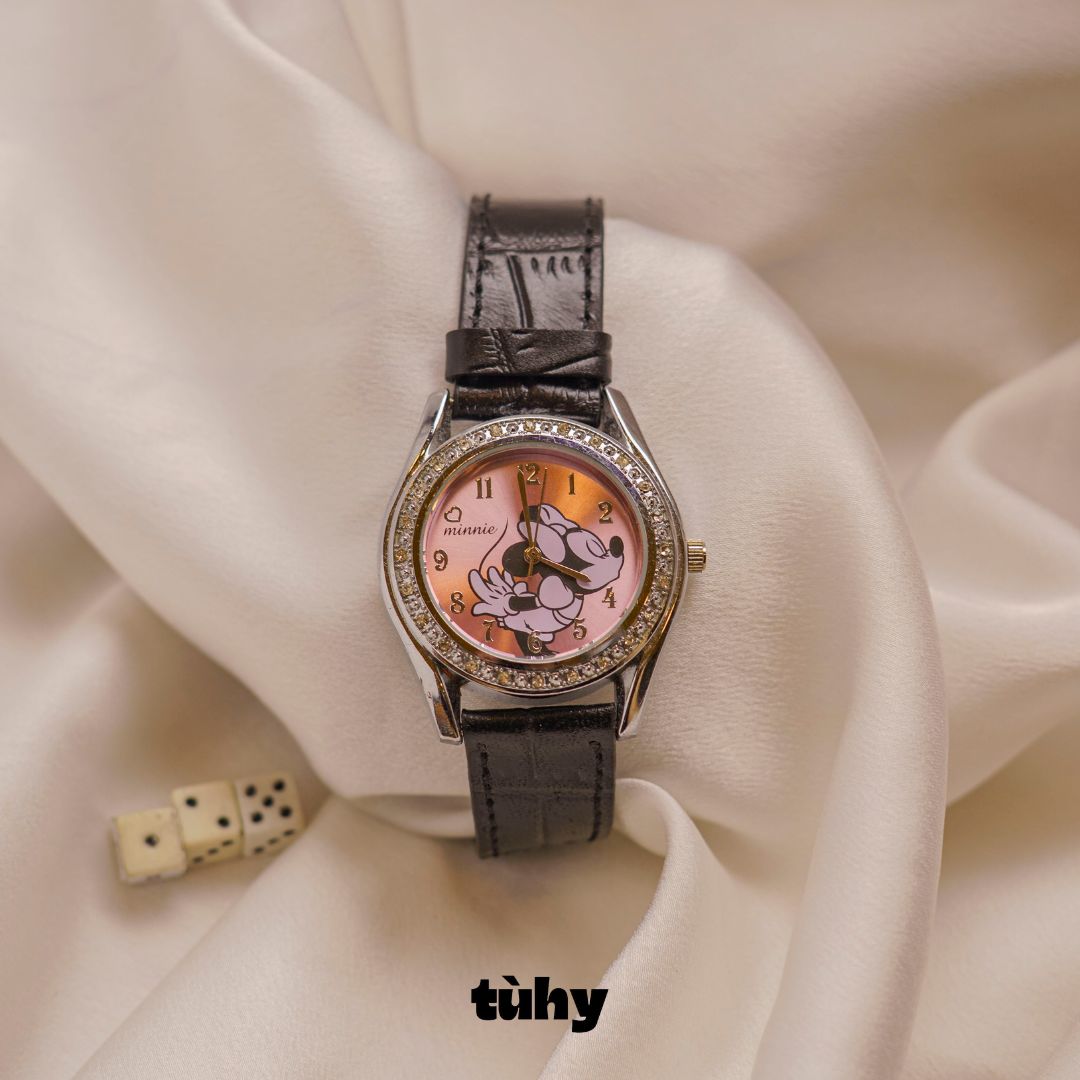 Disney Minnie Mouse dây da, dial hồng có hình Minne, niềng đính đá xung quanh