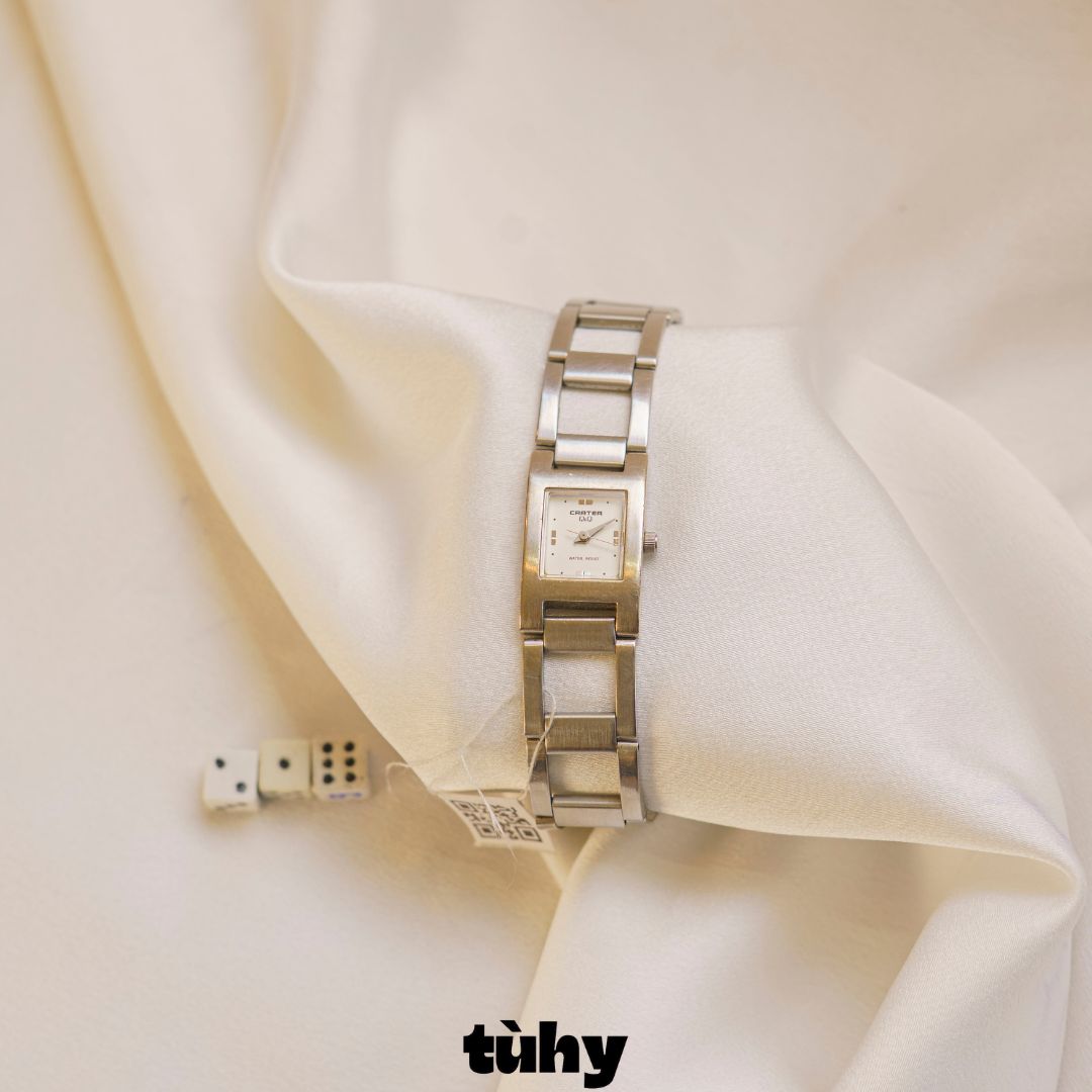 Q&Q Crater dạng lắc dây kiểu ô vuông bằng thép không gỉ, niềng vuông, dial trắng có cọc số 3,6,9,12 giờ cách điệu