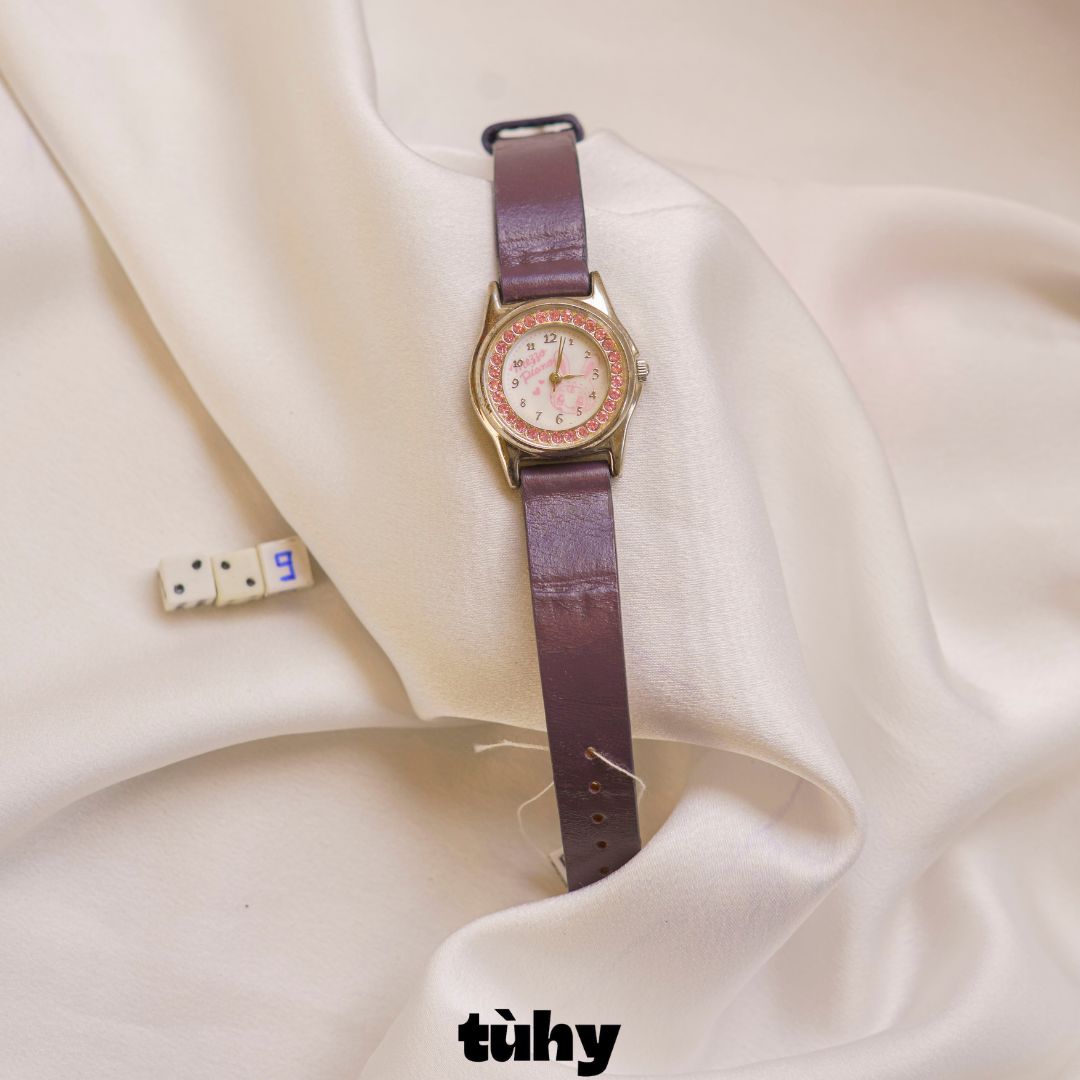 Vintage dây da, dial trắng có hình thỏ, niềng đính đá hồng