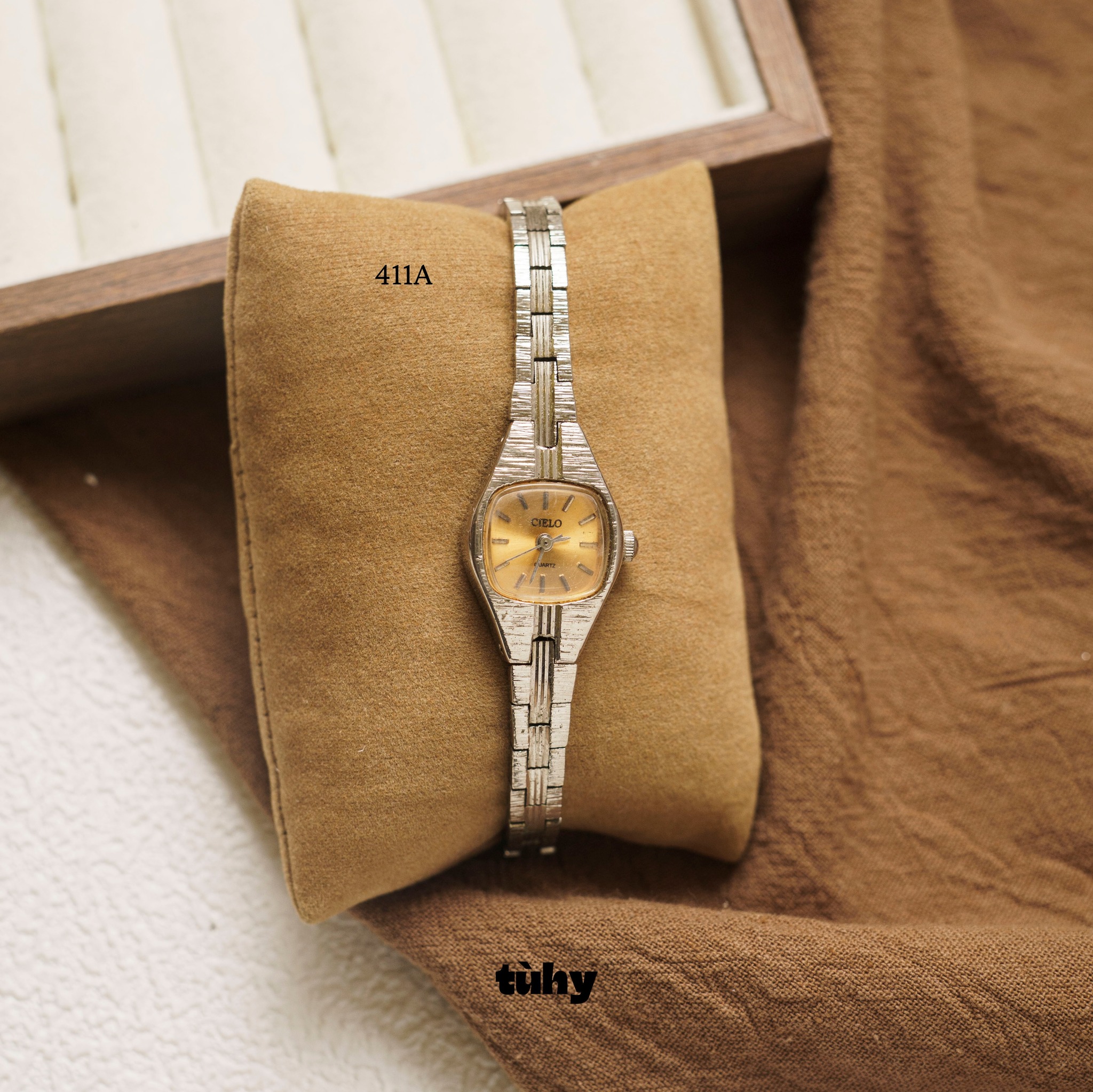 Đồng hồ nữ CIELO độc đáo, phong cách vintage. Vỏ và dây liền khối với họa tiết xước dọc nổi bật. Mặt đồng hồ dáng góc cạnh nhỏ gọn, nền vàng ánh kim sang trọng. Bộ kim thanh mảnh đơn giản. Như một món trang sức phù hợp với các cô nàng yêu thích sự khác biệt và cổ điển.