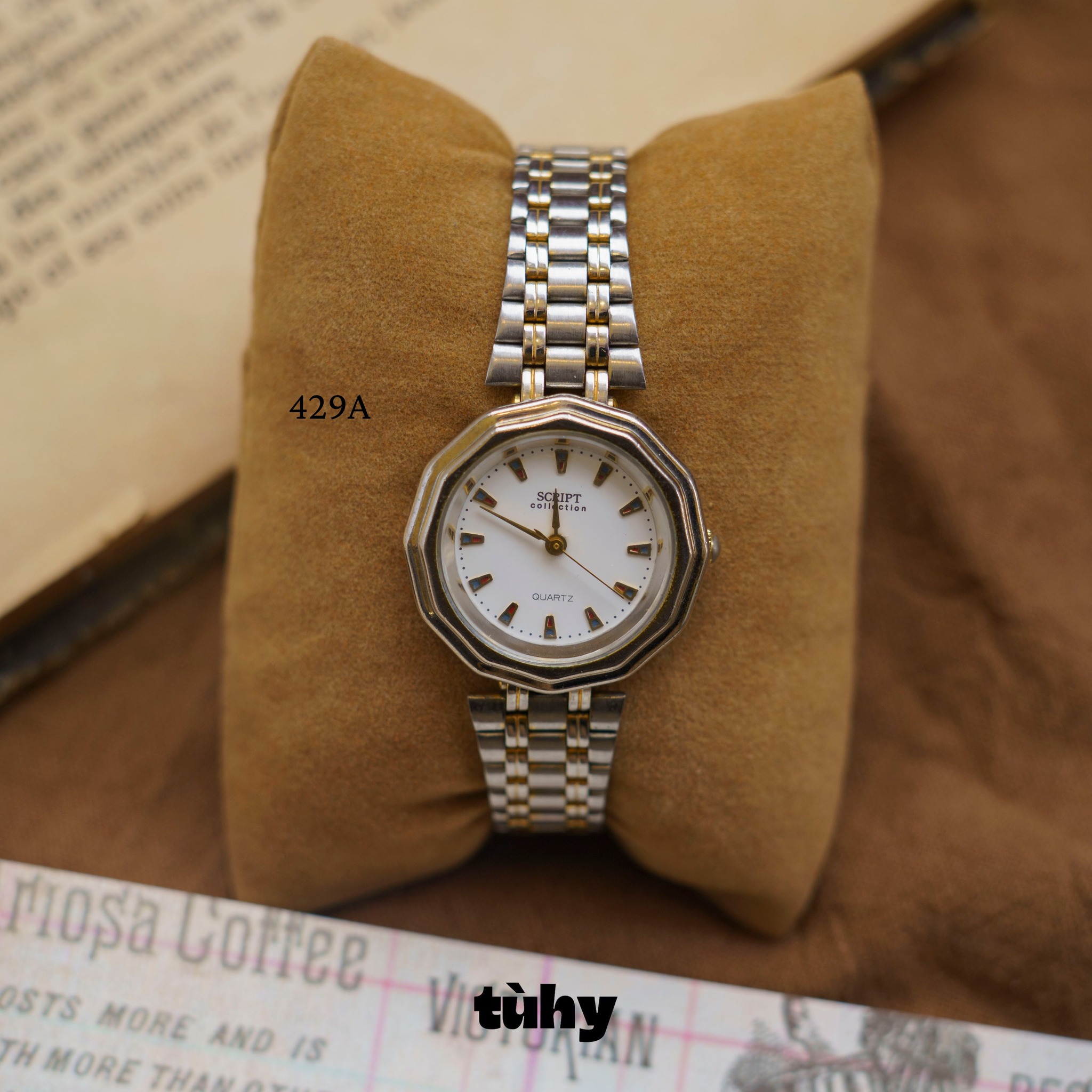 Một em Script Collection thiết kế niềng đa giác độc lạ dial trắng kim vàng đầy nổi bậc với cọc số dọc da quang chia vạch nhỏ dây demi thép không gỉ được trang bị khoá thông minh